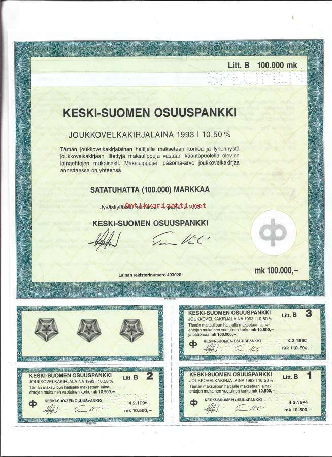 Keski-Suomen Osuuspankki Joukkovelkakirjalaina 1993 I 10 000 mk Jyväskylä 4.2.1993 specimen joukkovelkakirjalaina