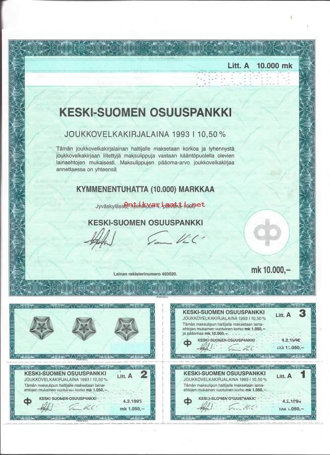 Keski-Suomen Osuuspankki Joukkovelkakirjalaina 1993 I 100 000 mk Jyväskylä 4.2.1993 specimen joukkovelkakirjalaina
