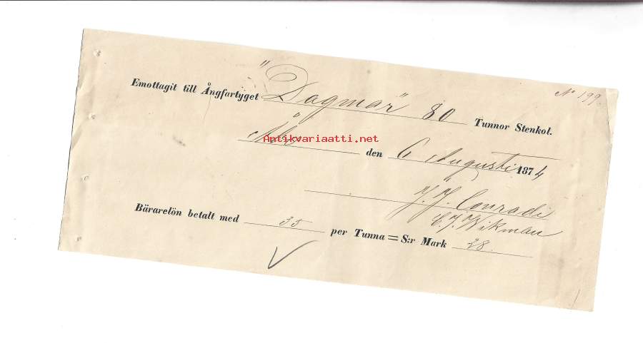 Alus: Höyrylaiva "Dagmar" (S/S Dagmar).Lasti: 80 tynnyriä kivihiiltä (Tunnor Stenkol).Sijainti: Turku (Åbo).Maksut: Kuitissa mainitaan kantajapalkka (Bärarelön) 35 penniä tynnyriltä, mikä tekee yhteensä 28 markkaa (S:r Mark 28).Allekirjoitukset: Asiakirjassa on kaksi allekirjoitusta