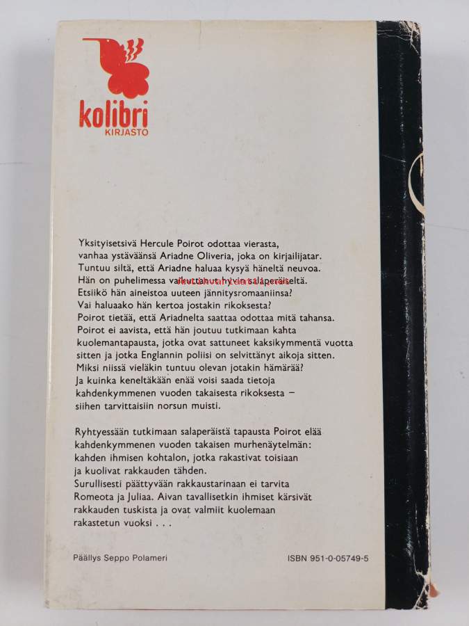 Muu(t) tekijä(t): Anna-Liisa LaineMerkinnät: omistajamerkintä (tarra)Sarja: Kolibri kirjastoAlkuteos: Elephants can rememberAsiasanat: hercule poirot