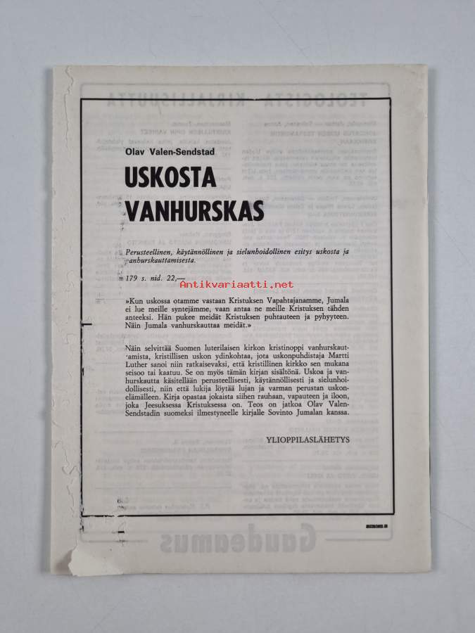 Tyydyttävä. Pienoista kulumaa, melko paljon repeämää takakannessa