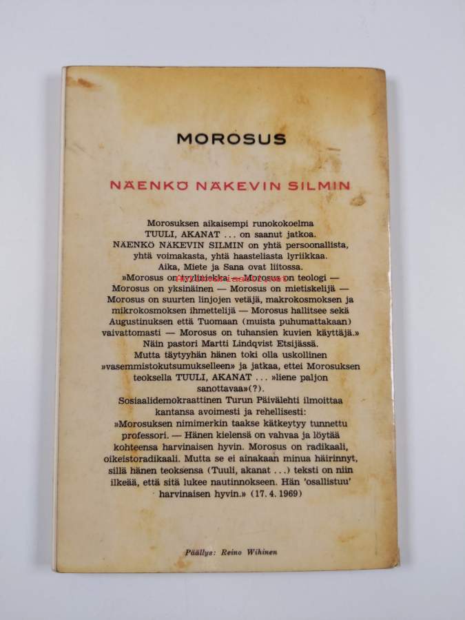 Huonokuntoinen (lukukelpoinen). Pientä nuhruisuutta, kontaktimuovipäällystys, kirjaston poistokirja. selkämyr revennyt irti sidoksesta, mutta kirja on silti yhtenä kappaleena