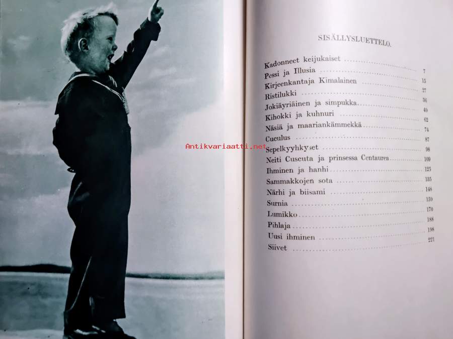 kuvakansien reunoissa ja kulmissa kulumaa, tyhjä ensilehti poissa, mustavalko kuvitus, kuvittanut Yrjö Kokko, sivut hyvin siistit, sisällysluettelo kuvassa