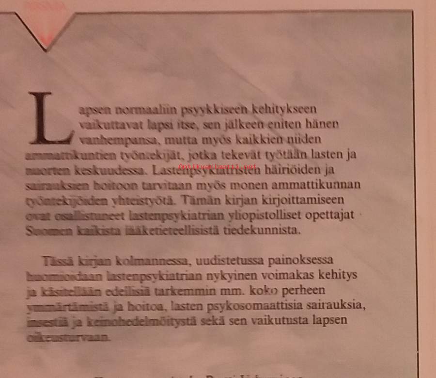 Teos käsittelee kattavasti lapsuusajan psyykkisiä ongelmia, mielenterveyshäiriöitä ja niiden hoitomuotoja, kuten perhe- ja taideterapiaa sekä psyykenlääkkeitä. Dimensiot 21 ¤ 14 cm