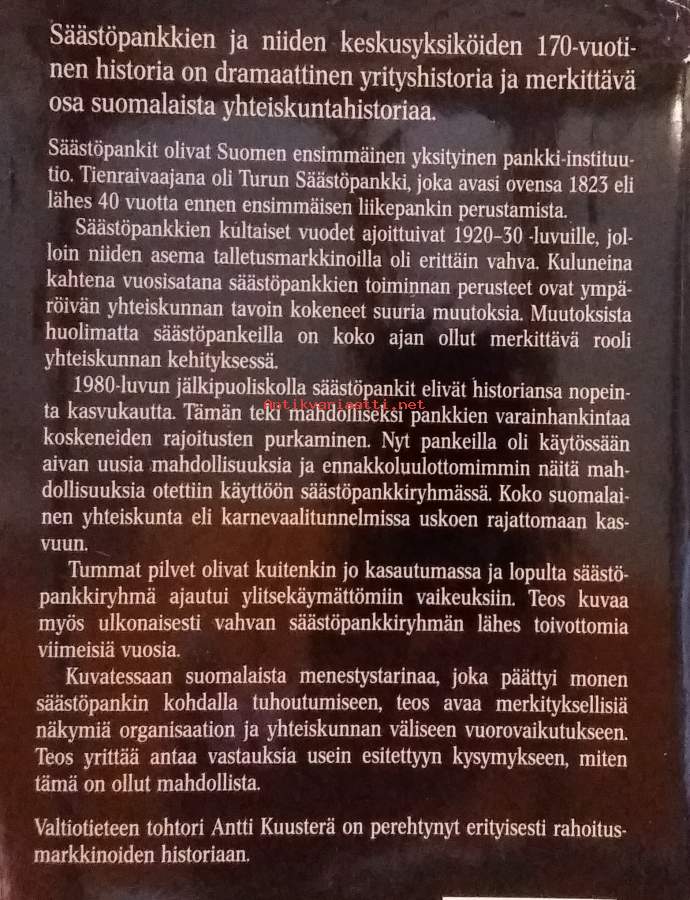 Tutkimus suomalaisen säästöpankkijärjestelmän synnystä, kehityksestä ja murroksista vuosina 1822–1994 kuvaa mm. säästöpankkien roolin suomalaisen yhteiskunnan ja talouden rakentumisessa tarkastellen myös säästöpankkiryhmän kriisiytymistä ja 1990‑luvun pankkikriisin taustatekijöitä. Kuvitettu. Dimensiot 24 ¤ 18 cm.