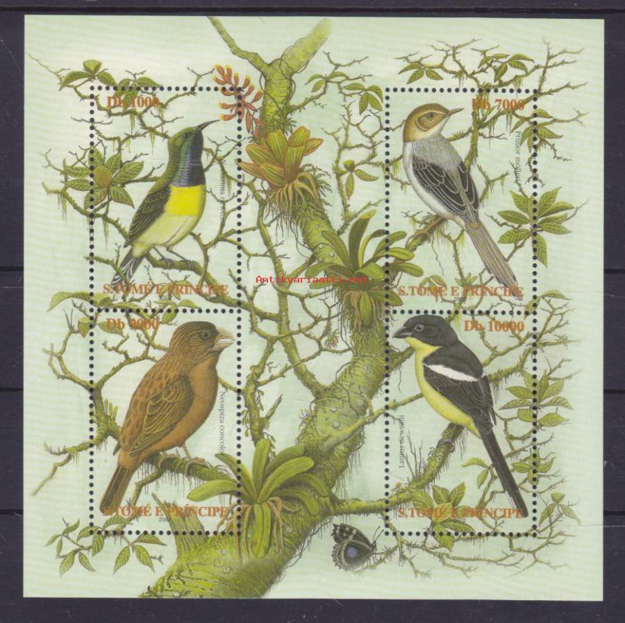 Filatelia São Tomé ja Príncipe - postituore ** blokki/pienoisarkki, 2002. (Lintuja: Keltavatsaturpiaali, pensasvarpunen, harmaakyyhky/ metsäkyyhky, nektarilintu)