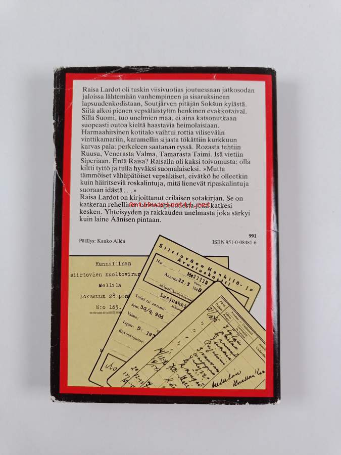Ripaskalinnut, 1978. 1. painos. Raisa Lardot oli tuskin viisivuotias joutuessaan jatkosodan jaloissa lähtemään vanhempineen ja