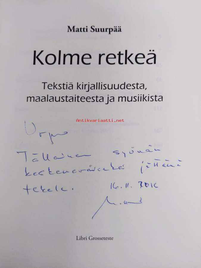 Kolme retkeä : tekstiä kirjallisuudesta, maalaustaiteesta ja musiikista (signeerattu, tekijän omiste)