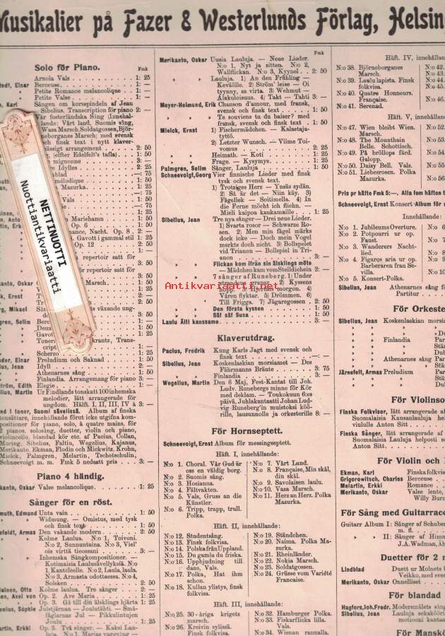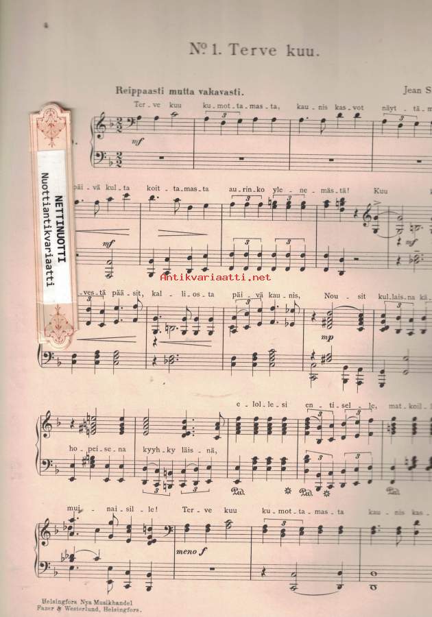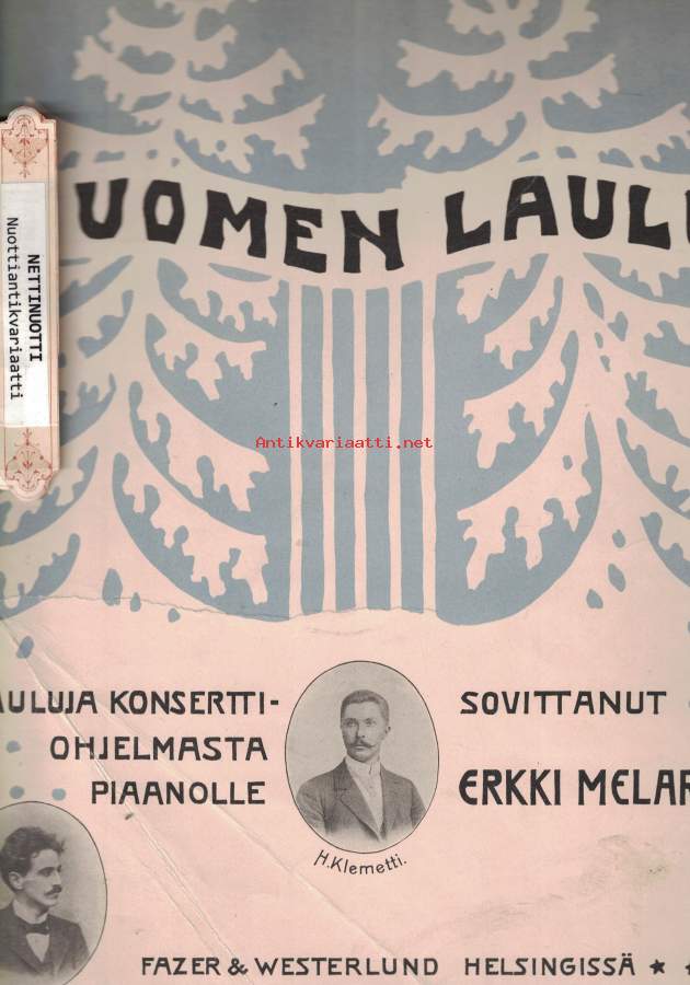 Partituuri. - Nuotinnos pianolle ja sanat nuotinnoksen yhteydessä. Kyseessä ei siis ole varsinainen yksinlaulunuotti, mutta se soveltuu yksin- ja kuorolaulun säestämiseen. - Valikoima perustuu vuonna 1900 perustetun Suomen Laulu -kuoron ohjelmistoon:Terve kuu, op18, nro 2 / Sibelius, JeanSortunut ääni, op18, nro 1 / Sibelius, JeanVenematka, op18, nro 3 / Sibelius, JeanI livets kamp / Faltin, RichardOnnelliset (Järnefelt) / Järnefelt, ArmasSirkka / Järnefelt, ArmasLohdutus, op42, nro 2 / Merikanto, OskarSaarella palaa, op18, nro 4 / Sibelius, JeanIi-ii / Genetz, EmilVoi jos ilta joutuisi / trad.Nyt on mun mielestäni / trad.Karjala / Genetz, EmilWacht am Rhein / Wilhelm, Karl 27x34cm- Postipaketti