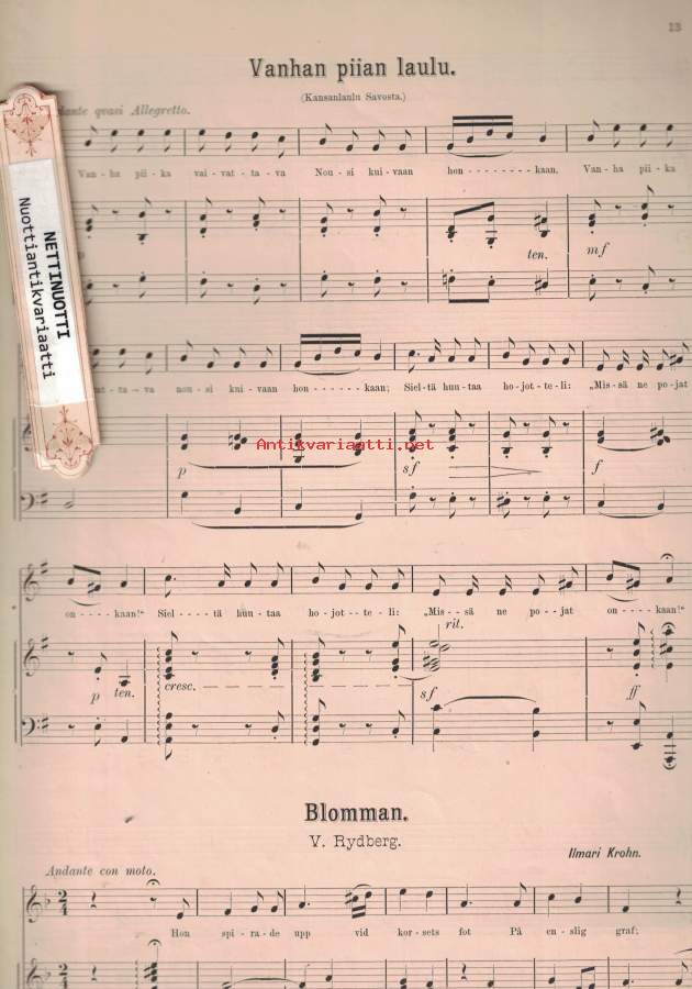 1 O, visste han blott!Flodin, Karl, säveltäjä ; Malmström, Karl Robert, kirjoittaja2 Norsk folkvisaFlodin, Karl, säveltäjä3 Inges sång ur brölloppet på UlfåsaFlodin, Karl, säveltäjä ; Hedberg, Frans Teodor, kirjoittaja4 Ur Heines 'Neuer Frühling'Flodin, Karl, säveltäjä ; Heine, Heinrich, kirjoittaja5 KyynelUusia lauluja, op34. Nro 3, KyynelMerikanto, Oskar, säveltäjä ; Erkko, J. H., sanoittaja6 Iltaselle : op. 2.IltaselleKrohn, Ilmari, säveltäjä ; Krohn, Julius7 Neidon rangaistusNeidon rangaistusKrohn, Ilmari, säveltäjä ; Krohn, Julius, kirjoittaja8 Vanhan piian laulu9 BlommanBlommanKrohn, Ilmari, säveltäjä ; Rydberg, Viktor10 Irrskenet på hedenLaethén, Rafael, säveltäjä ; Topelius, Zacharias11 KyssenKyssenSörensen, Theodor, säveltäjä ; Runeberg, Johan Ludvig12 Sång och sorgSörensen, Theodor, säveltäjä ; Rosendahl, K. kääntäjä13 Under väntan på den älskadeSörensen, Theodor, säveltäjä14 SerenadSerenadSörensen, Theodor, säveltäjä15 Hjertats visaNyblom, Carl Rupert, kirjoittaja- Postipaketti