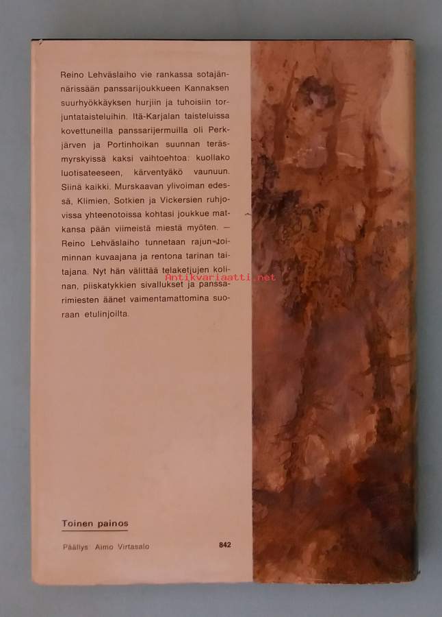 Kirja kuvaa Karjalan kannaksen viivytystaisteluita pienen panssarijoukkueen näkökulmasta. "Konnunsuon konnat" joutuvat Perkjärven ja Portinhoikan teräsmyrskyihin, joissa ylivoimaista vihollista vastassa on vain kourallinen miehiä ja kalusto. Dimensiot 20 ¤ 15 cm.