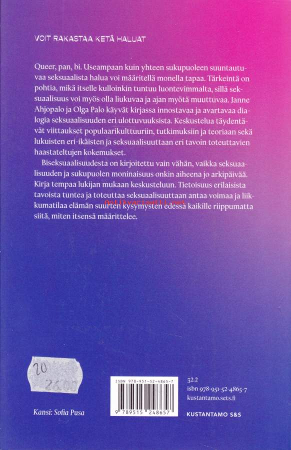 **Voit rakastaa ketä haluat: queer, pan, bi**Kirja pyrkii selittämään, mitä biseksuaalisuus on, ja tarkemmin: mitä eri ihmiset tarkoittavat, kun sanovat olevansa biseksuaaleja? Keskusteluissa nousee ilmi, kuinka vahvasti homo-hetero -jako elää paitsi sateenkaariyhteisön sisällä, niin myös ylipäätään länsimaisessa kulttuurissa. Usealla haastateltavalla on kokemus siitä, ettei heidän identiteettiään oteta tosissaan: jos nainen seurustelee toisen naisen kanssa, täytyy tämän olla lesbo, mutta jos seuraava kumppani on mies, on tämä sitten ulkopuolisten silmissä muuttunut heteroksi.**