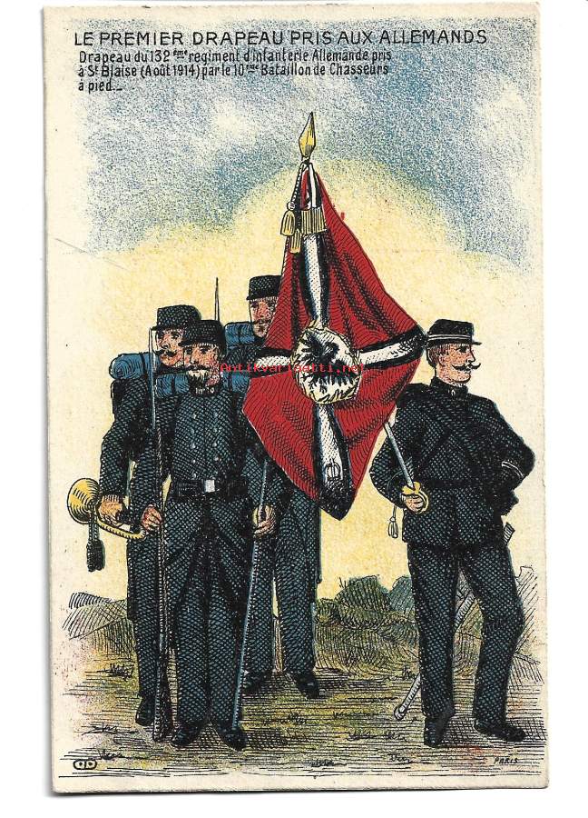 Kuva esittää historiallisen hetken ensimmäisen maailmansodan alusta, jolloin ranskalaiset sotilaat ottivat haltuunsa saksalaisen lipun.Kuva esittää ensimmäisen saksalaisen lipun takavarikointia sodan alussa.Lippu kuului Saksan 132. jalkaväkirykmentille.Ranskan 10. Chasseurs à pied (jalkaväen metsästäjä) -pataljoona valtasi lipun.Tapahtuma sijoittuu St Blaiseen elokuussa 1914.