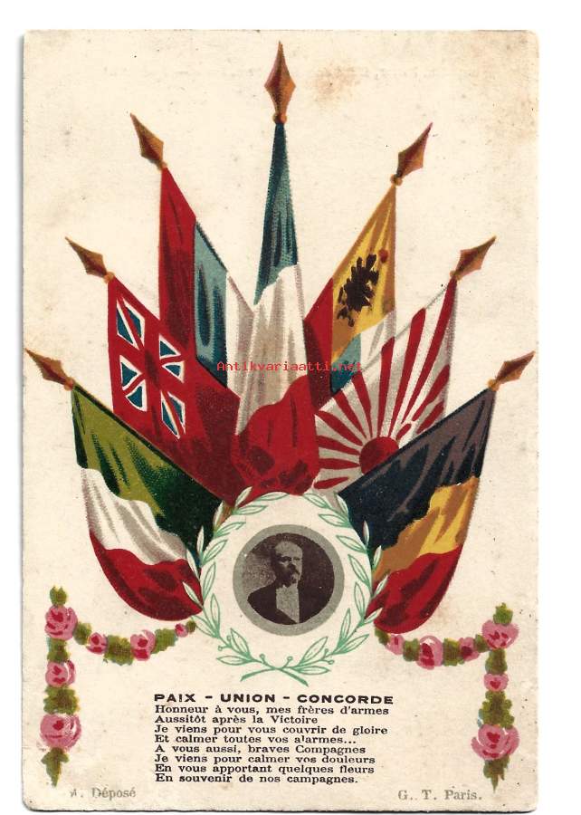 ranskalainen vintage-postikortti, joka juhlistaa liittoutuneiden voittoa. Kortissa on liittoutuneiden maiden lippuja ja teksti "PAIX - UNION - CONCORDE" (Rauha - Liitto - Sopu).Se on painettu Pariisissa, ja siinä on kuva sotilasjohtajasta seppeleen sisällä.