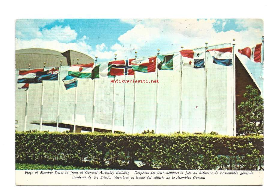 Kuva esittää Yhdistyneiden kansakuntien päämajaa New Yorkissa, jossa jäsenvaltioiden liput liehuvat yleiskokouksen rakennuksen edessä. Rakennuskompleksi sijaitsee Manhattanilla East Riverin varrella.Alue on kansainvälistä aluetta, joka kuuluu 193 jäsenvaltiolle.Päämaja valmistui pääosin vuosina 1949–1952.