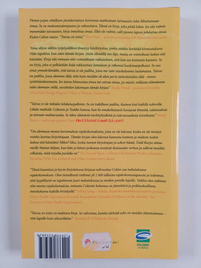 Muu(t) tekijä(t): Lynn Vincent, Heli JaakkolaMerkinnät: omistajamerkintäAlkuteos: Heaven is for realAsiasanat: muistelmat, papit, lapset, kuolemanrajakokemukset