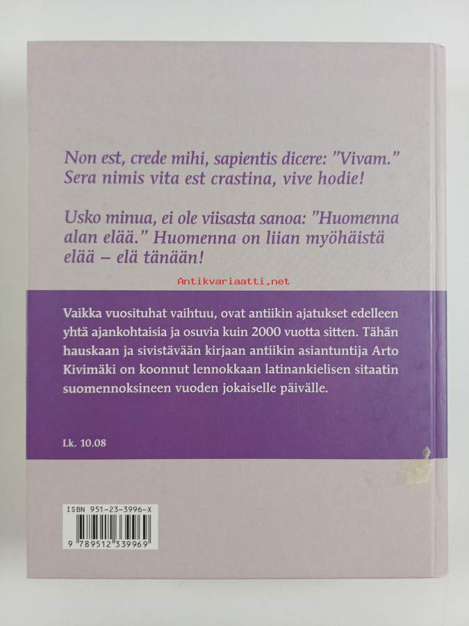 Hyvä. Tarkempi kuntoluokka: K3+ ; Aivan pienoista kolhua selkämyksen päissä, pienoista kulumaa kansissa, takana hintalapun jäämää