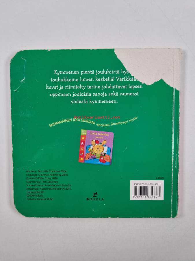 Muu(t) tekijä(t): Terhi LeskinenSarja: Ensimmäinen joulukirjaniAlkuteos: Ten little Christmas miceAsiasanat: joulu, numerot, laskeminen