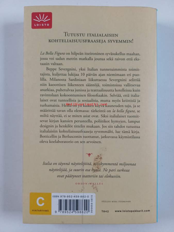 Muu(t) tekijä(t): Hannimari HeinoMerkinnät: omistajamerkintäAlkuteos: La testa degli italiani : una visita guidataAsiasanat: kulttuuri, identiteetti, italialaiset, italialaisuus