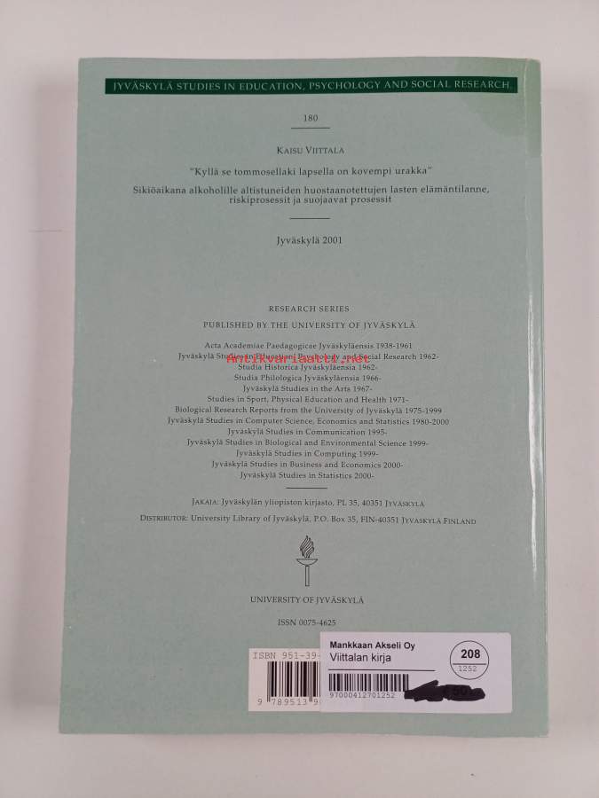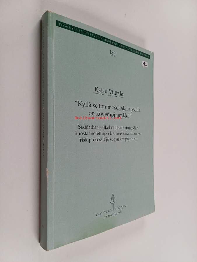 Koko nimi: "Kyllä se tommosellaki lapsella on kovempi urakka" : sikiöaikana alkoholille altistuneiden huostaanotettujen lasten elämäntilanne, riskiprosessit ja suojaavat prosessitSarja: Jyväskylä studies in education, psychology and social research 180Asiasanat: väitöskirjat, lapset, alkoholi, lastensuojelu, selviytyminen, lapsen asema, huostaanotto, altistuminen, sikiö, lapsen kehitys, elämäntilanne, riskitekijät, sikiön alkoholioireyhtymä