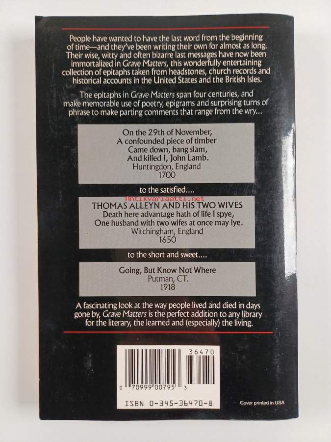 Koko nimi: Grave Matters - A curious collection of 500 actual epitaphs, from which we learn of grieving spouses, fatal gluttony, vengeful relations and all manner of parting commentaryMerkinnät: omistajamerkintä