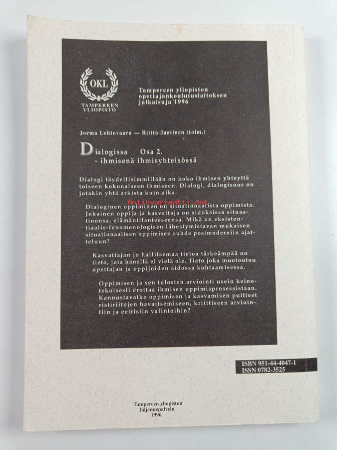 Muu(t) tekijä(t): Riitta Jaatinen, Jorma LehtovaaraSarja: Dialogissa Osa 2; Tampereen yliopiston opettajankoulutuslaitoksen julkaisuja. A 1996, 8; Tampereen yliopiston opettajankoulutuslaitoksen julkaisuja. A 8/1996; Tampereen yliopiston opettajankoulutuslaitoksen julkaisuja. A A 8/1996Asiasanat: koulutus, arviointi, filosofia, itsetuntemus, hoitotyö, ihmiskuva, yhteisöllisyys, vuorovaikutus, opetus, opettajat, kasvatus, oppiminen, kokonaisvaltaisuus, opetusmenetelmät, ammattitaito, fenomenologia, oppilaat, yksilöllisyys, kasvatusfilosofia, opettaja-oppilassuhde, oppimisprosessi, sosiaaliala, sosiaalityöntekijät, kasvu, opetustilanne, postmodernismi, yksilö, dialogi, reflektio, terveysala, sosiaaliohjaajat