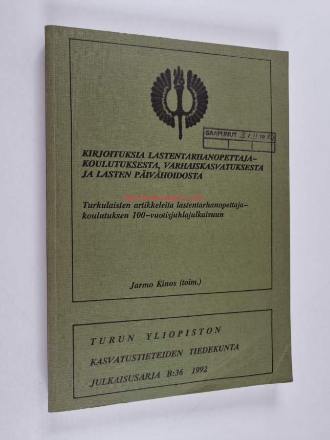 Koko nimi: Kirjoituksia lastentarhanopettajakoulutuksesta, varhaiskasvatuksesta ja lasten päivähoidosta : turkulaisten artikkeleita lastentarhanopettajakoulutuksen 100-vuotisjuhlajulkaisuunMuu(t) tekijä(t): Jarmo KinosSarja: Julkaisusarja / Turun yliopiston kasvatustieteiden tiedekunta. B, Selosteita 36Asiasanat: historia, koulutus, lastenhoito, korkea-asteen koulutus, päivähoito, varhaiskasvatus, opettajankoulutus, lapset (ikäryhmät), varhaiskasvatuksen opettajat