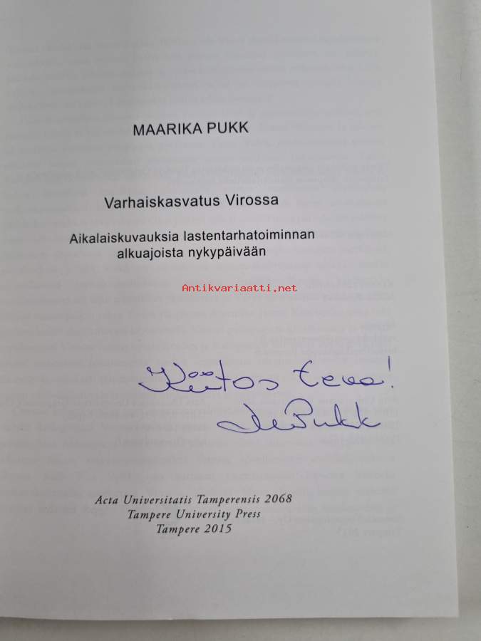 Varhaiskasvatus Virossa : Aikalaiskuvauksia lastentarhatoiminnan alkuajoista nykypäivään (signeerattu, tekijän omiste)
