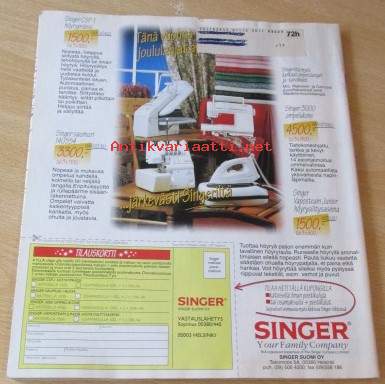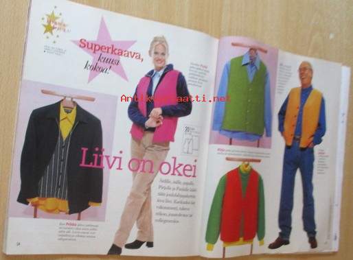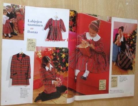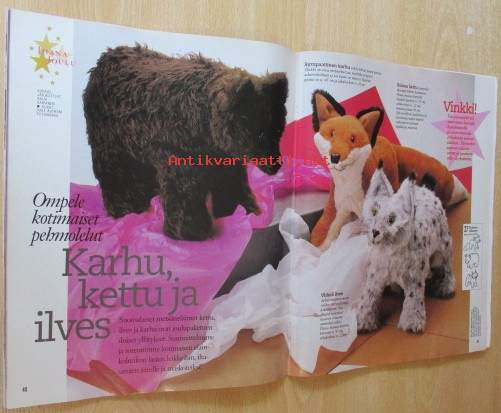Kaava-arkit ja silityskuvioarkki mukana irti lehdestä, Lehti siisti ehjä, takakannessa edellisen omistajan nimi ylivedetty kynällä, Postitus kirjepakettina