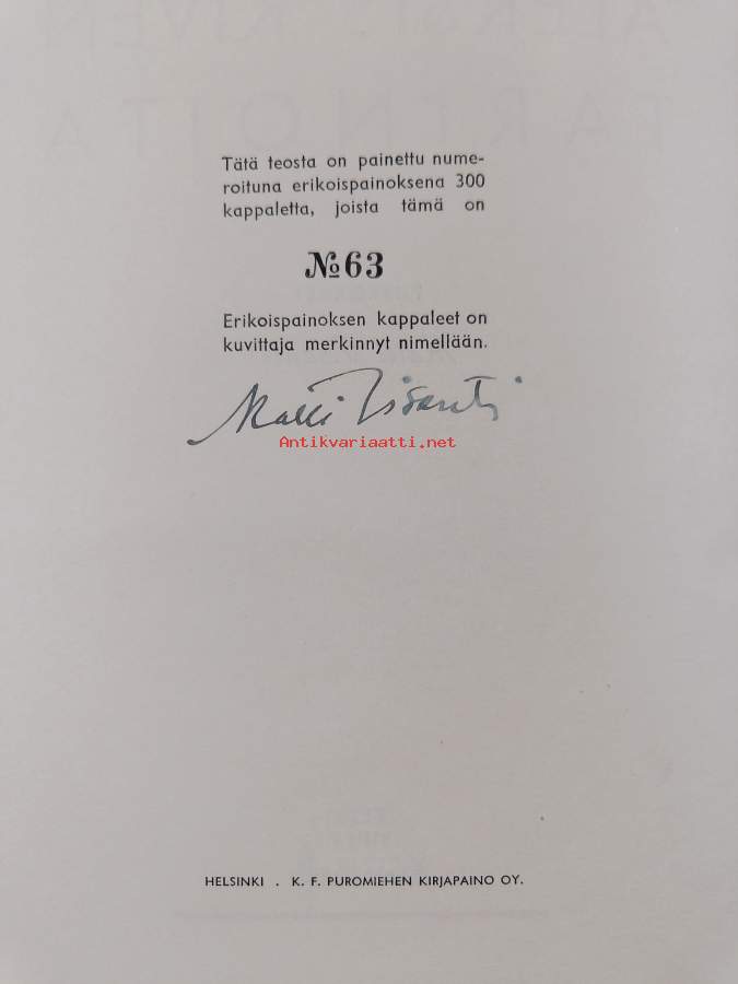 Tyydyttävä. Tarkempi kuntoluokka: K2+ ; Hieman repeämää reunoilla ja kulmissa, hieman nuhruisuutta kansissa, selkämyksessä aavistus vinoutta. nro 63/300 Visannin signeeraus ; muutamalla sivulla pienoista tahraa