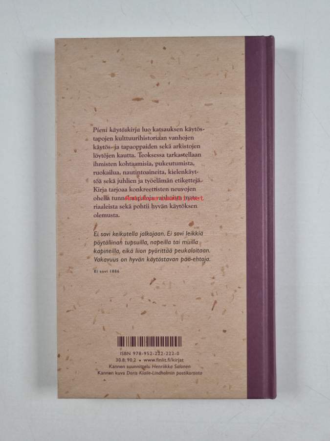 Muu(t) tekijä(t): Satu LaatikainenSarja: FolkloreAsiasanat: historia, kulttuurihistoria, seuraelämä, käytösoppaat, tavat, tapakulttuuri, etiketti, työelämä, pukeutuminen, tervehdykset, kielenkäyttö, tapakasvatus, ruokailu, tavat (tapakulttuuri), 1800-luku, 1900-luku