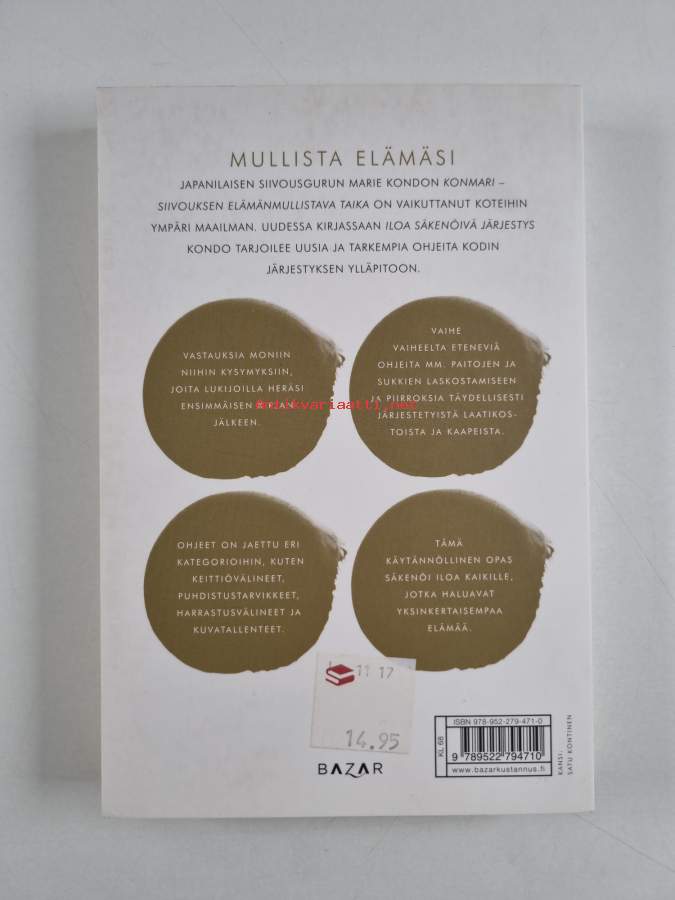 Muu(t) tekijä(t): Päivi Rekiaro, Marie KondoAsiasanat: koti, kodinhoito, järjestys, järjestäminen, siivous, tavarat, säilytys, esineet, säilytystilat