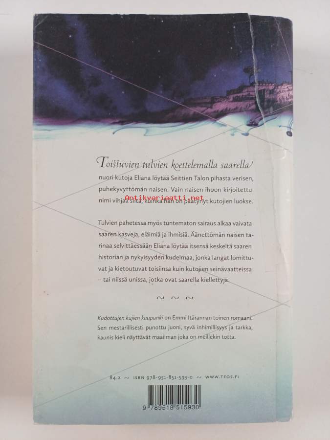 Kansipaperin kunto: repeämiä/kulumaa / kansipaperissa koko takakannen pituinen repeämä jota on teipattu, kolmen viimeisen sivun kulmissa taittumaa