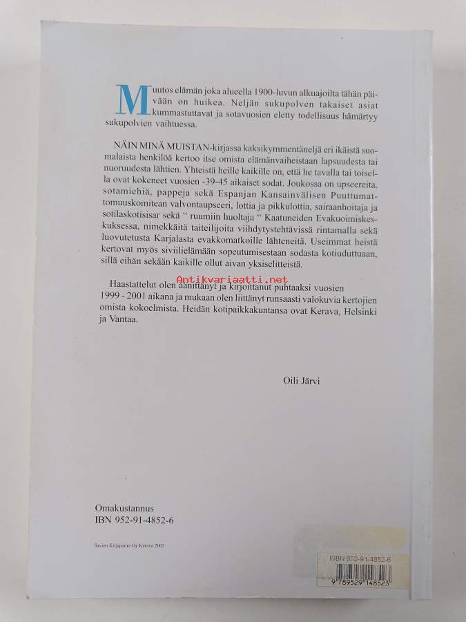 Muu(t) tekijä(t): Oili JärviMerkinnät: omistajamerkintäAsiasanat: muistelmat, talvisota, sota-aika, nuoruus