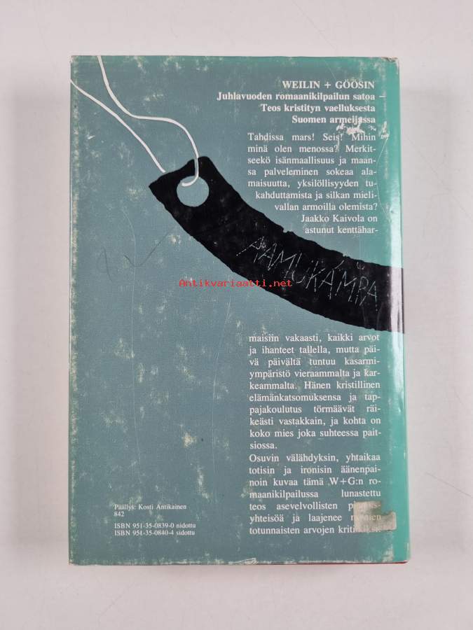 Hyvä. Pienoista kolhua kansissa, selkämyksessä hieman vinoutta, tyhjä etulehti irrotettu. Kansipaperin kunto: jonkin verran kulumaa/pienoisia repeämiä