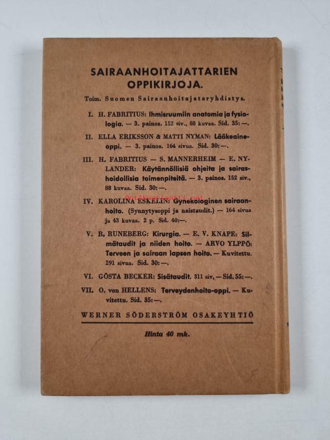 Sairaanhoitajattarien oppikirja. 2, Lääkeaineoppi : (farmakologia)KirjaVartiainen, Ilmari ; Sairaanhoitajatarjärjestö. Oppikirjakomitea ; WSOY 1940.