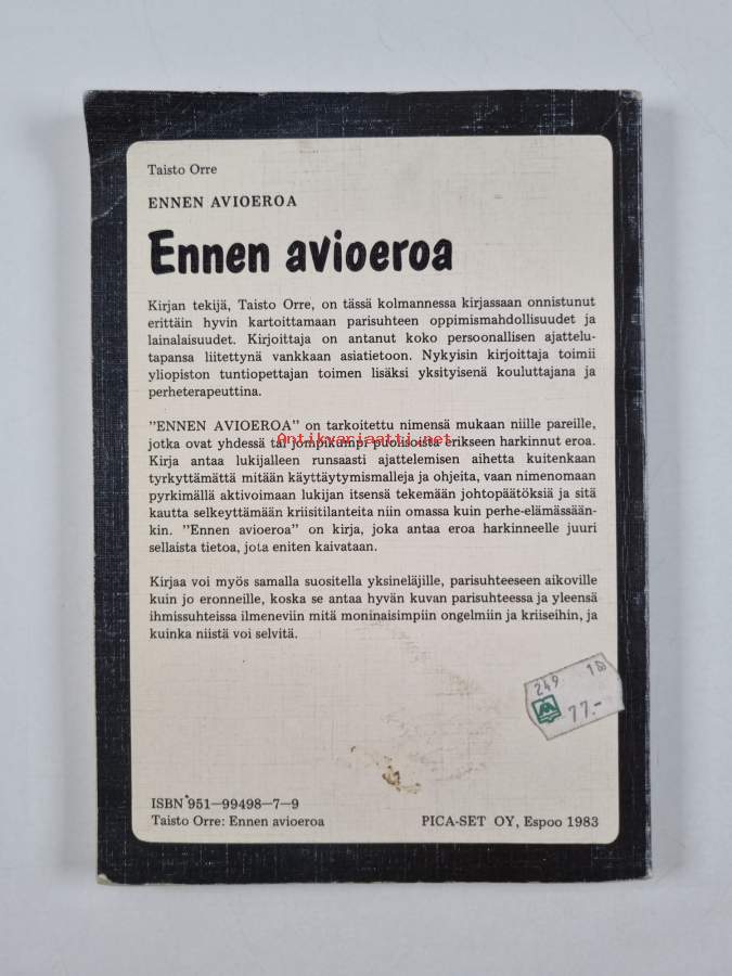 Tyydyttävä. Tarkempi kuntoluokka: K2+ ; Pientä kulumaa kansissa, hieman repeämää selkämyksen alakulmassa, selkämyksessä hieman vinoutta, takana vanha hintalappu