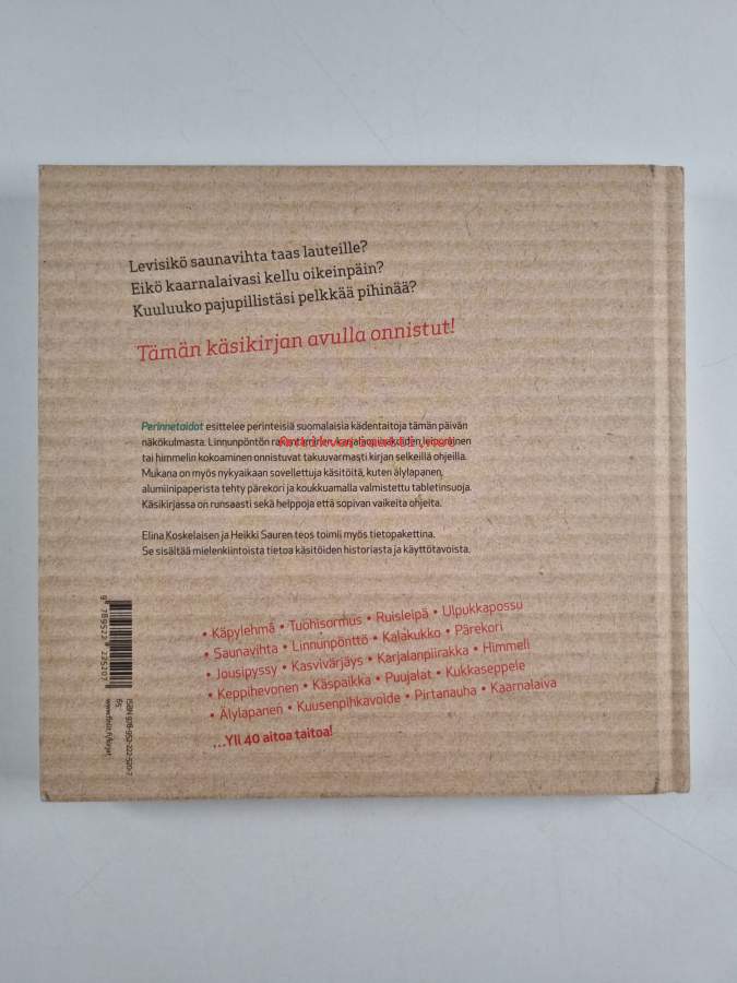 Muu(t) tekijä(t): Heikki Saure, Sanna Peurakoski ym.Sarja: Kirjokansi 51Asiasanat: valmistus, askartelu, ruokaohjeet, käsityöohjeet, historia, ruoanvalmistus, käsityöt, tilkkutyöt, ompelu, neulonta, ruokaperinne, virkkaus, käsityöperinne, ryijyt, koristeet, kudonta, ristipistotyöt, korut, huovutus, leikkikalut, puutyöt, linnunpöntöt, värjäys, punontatyöt, luonnonmateriaalit, himmelit, kädentaidot, kynttilät, tuohityöt, käspaikat, nauhat, jouset, vastat