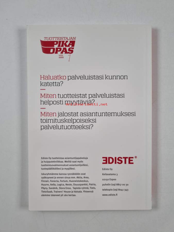 Sarja: Tuotteistajan pikaopas vol. 1Asiasanat: markkinointi, palvelut, yritykset, myynti, tuottavuus, markkinointiviestintä, tuotekehitys, tuotteistus, tuotteet, Marketing, Commodification