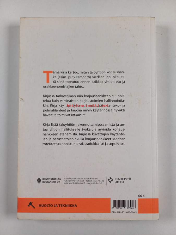 Merkinnät: omistajamerkintä (leima)Sarja: Huolto ja tekniikkaAsiasanat: rakentaminen, johtaminen, päätöksenteko, asunto-osakeyhtiöt, vastuu, turvallisuus, korjausrakentaminen, projektit, rakennuttaminen, valvonta, kiinteistöosakeyhtiöt, hankesuunnittelu, vakuutus, projektijohtaminen, aikataulut, urakoitsijat, urakat, vahingot ja vauriot, muutostyöt, hyvitys