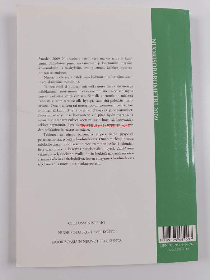 Muu(t) tekijä(t): Sami MyllyniemiSarja: Nuorisotutkimusverkosto/Nuorisotutkimusseura, julkaisuja 97; Nuorisoasiain neuvottelukunta, julkaisuja 41; Nuorisobarometri 2009; Julkaisuja / Nuorisoasiain neuvottelukunta 41; Julkaisuja / Nuorisotutkimusverkosto/Nuorisotutkimusseura 97; [Opetusministeriön julkaisuja]Asiasanat: Internet, taide, nuoret, kulttuuri, aikuisuus, nuoruus, työ, kulttuuripalvelut, nuorisokulttuuri, käsitykset, syrjäytyminen, tatuointi, harrastukset, doping, sukupolvet, taideharrastukset, luova toiminta, erottautuminen, kulttuuriharrastukset, lävistys, konst, uppfattningar, Ungdomar, kultur, kulturtjänster, hobbyer, ungdom (skede), arbete, vuxenhet, generationer, utslagning, konstarter, ungdomskultur, skapande verksamhet, tatuering, kulturella intressen, dopning, taiteenlajit, särskilja sig, konstintressen, ravintolisät, piercing, kosttillskott