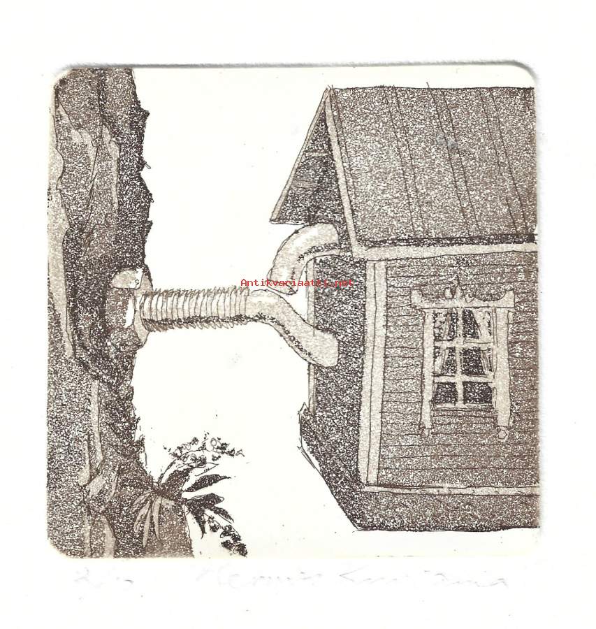 Hermes Kuusama (1927–2003) tekemä grafiikan työ.Kuusama tunnetaan erityisesti pikkutarkoista ja usein humoristisista tai surrealistisista grafiikanlehdistään. Hänen teoksissaan toistuvat usein rakennukset, koneet ja luonnon elementit, jotka on yhdistetty toisiinsa mielikuvituksellisella tavalla. Tässä teoksessa nähdään puuhun putkilla tai paljekoneistolla yhdistetty mökki, mikä on hyvin tyypillistä hänen tuotannolleen.Kuusama asui ja työskenteli Lappeenrannassa, ja hän oli Etelä-Karjalan taide-elämän keskeisiä hahmoja. Hänen töitään on muun muassa Lappeenrannan taidemuseon kokoelmissa.