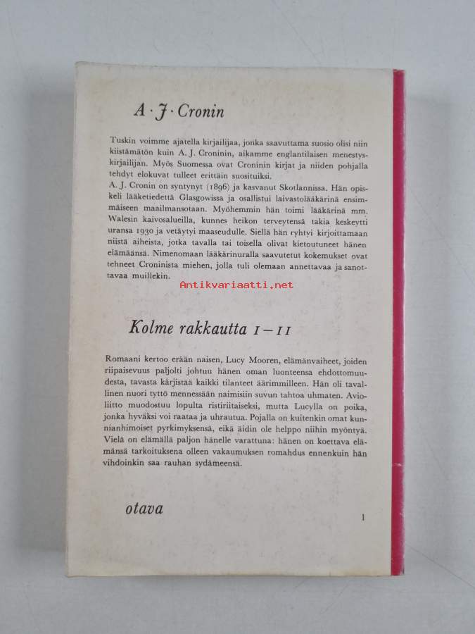 Hyvä. Tarkempi kuntoluokka: K3- ; Pienoista repeämää yhdessä kulmassa, pientä kulumaa, selkämyksessä hieman vinoutta, selkämyksessä lukutaittumaa, joidenkin sivujen kulmia taitettu. selkämys haalistunut