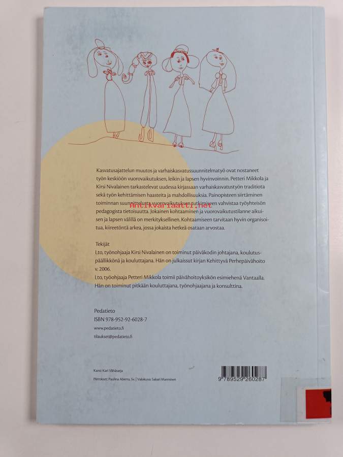 Muu(t) tekijä(t): Kirsi NivalainenAsiasanat: lapsuus, työyhteisöt, vuorovaikutus, kasvatus, oppiminen, pedagogiikka, päivähoito, varhaiskasvatus, päiväkodit, pienryhmät, tiimityö, leikkiminen, toimintakulttuuri, lapset (ikäryhmät)
