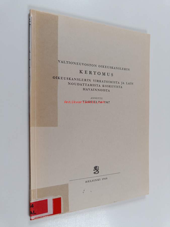 Valtioneuvoston oikeuskanslerin kertomus oikeuskanslerin virkatoimista ja lain noudattamista koskevista havainnoista annettu vuodelta 1967