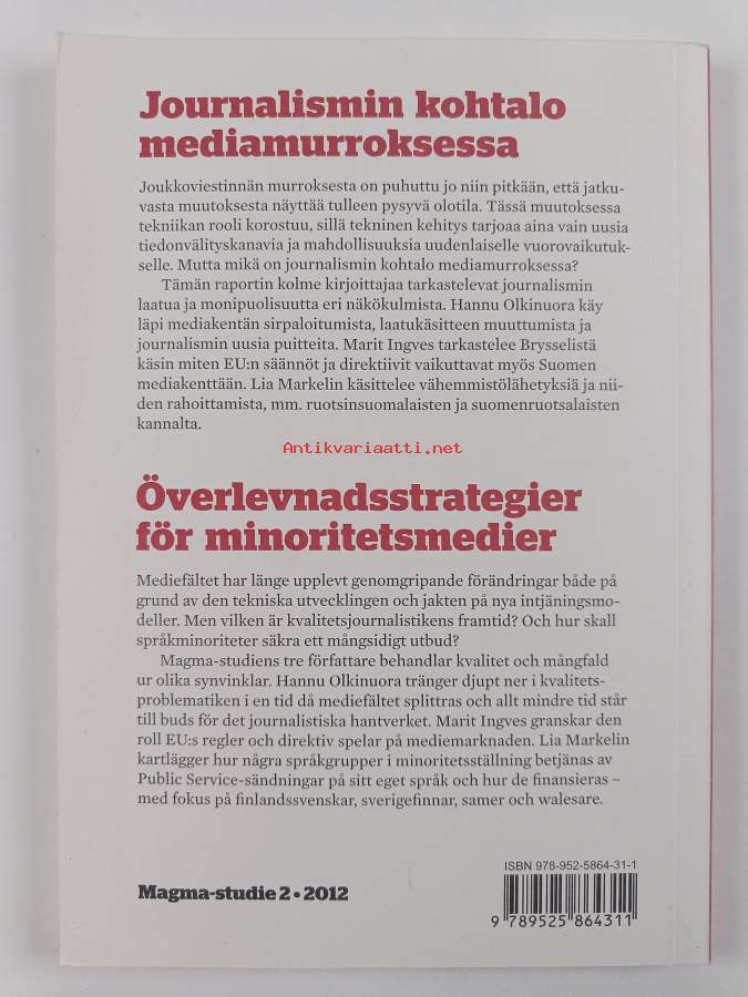 Koko nimi: Journalismin kohtalo mediamurroksessa Överlevnadsstrategier för minoritetsmedier med fokus på public service - Överlevnadsstrategier för minoritetsmedier med fokus på public serviceMuu(t) tekijä(t): Marit Ingves, Mia MarkelinSarja: Magma-studie 2/2012Asiasanat: Internet, journalismi, radio, käyttö, sanomalehdet, televisio, suomenruotsalaiset, joukkoviestimet, media, saamelaiset, rahoitus, mediakritiikki, ruotsinsuomalaiset, viestintäpolitiikka, kielipolitiikka, mediakasvatus, vähemmistökielet, språkliga minoriteter, finlandssvenskar, offentlig service, samer, journalistik, språkpolitik, massmedier, sverigefinländare, mediebranschen, kommunikationspolitik