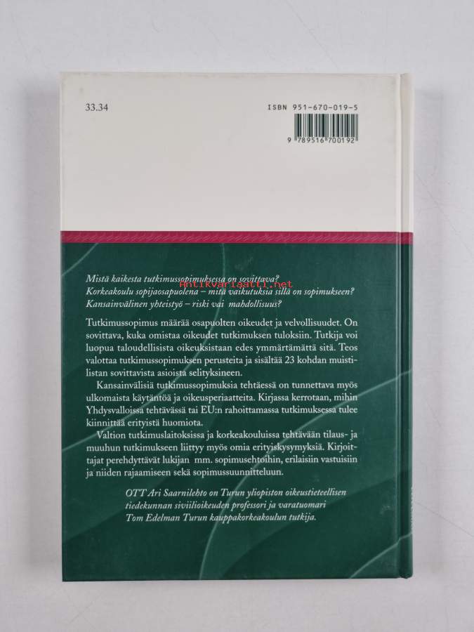 Muu(t) tekijä(t): Ari Saarnilehto, Tom EdelmanMerkinnät: omistajamerkintä (leima)Asiasanat: tutkimuslaitokset, tutkimus, yritykset, lainsäädäntö, tekijänoikeus, työelämä, kilpailu, sopimusoikeus, keksinnöt, sopimukset, tutkijat, yliopistot, ammattikorkeakoulut, tietosuoja, tutkimuspolitiikka, tutkimusetiikka, tutkimustyö, immateriaalioikeus, korkeakoulut, tiedepolitiikka, tutkimustoiminta, tutkimus- ja kehittämistoiminta, salassapitovelvollisuus, research, oikeus (oikeudenala), arbetsliv, företag, tutkimusprojektit, universitet, forskning, forskningsarbete, forskningsverksamhet, forskningsprojekt, yrkeshögskolor, forskare, lagstiftning, avtal, uppfinningar, sopimusehdot, forskningspolitik, forskningsinstitut, högskolor, upphovsrätt, forskning och utveckling, rätt (rättsområde), sopimus, research workers, immaterialrätt, avtalsrätt, rojaltit, datasekretess, tystnadsplikt, vetenskapspolitik, forskningsetik, Intellectual property, avtalsvillkor, Research Support, Research Support as Topic, kilpailu (talous), konkurrens (ekonomi)
