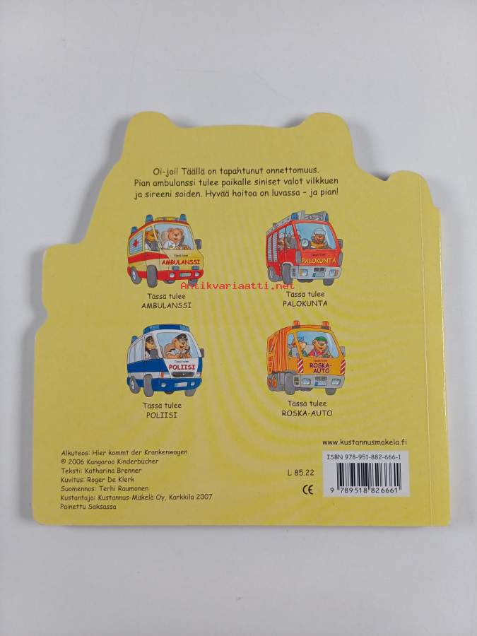 Muu(t) tekijä(t): Terhi Raumonen, Roger De KlerkAlkuteos: Hier kommt der KrankenwagenAsiasanat: ensiapu, onnettomuudet, lastenkirjallisuus, kuvakirjat, paksulehtiset kirjat, ambulanssit