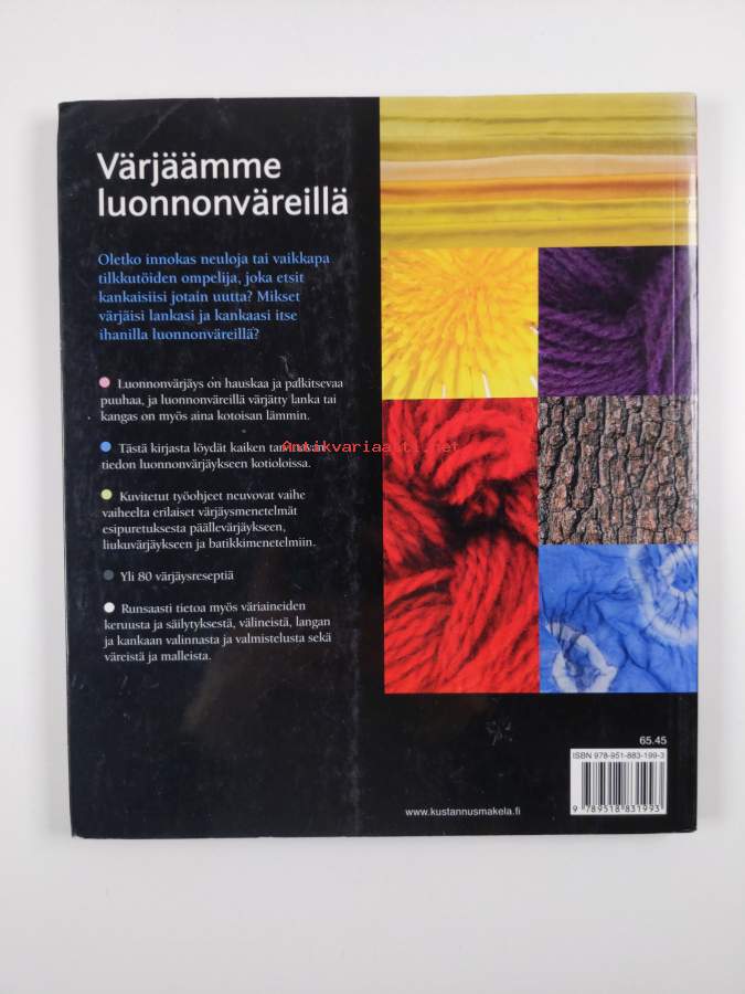Muu(t) tekijä(t): Heli MäntyrantaAlkuteos: The complete guide to natural dyeingAsiasanat: värit, väriaineet, tekstiilit, kankaat, värjäys, luonnonaineet, langat, kasvivärjäys, kasvivärit, väriainekasvit, garn, tyg, färgämnen, färgning, växtfärgning, färgväxter