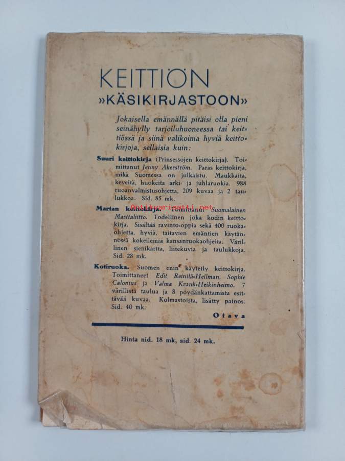 Huonokuntoinen (lukukelpoinen). Melko paljon tahraisuutta, melko paljon kulumaa, hieman repeämää, kontaktimuovipäällystys. kansissa repeämää, kannet lähes irronneet